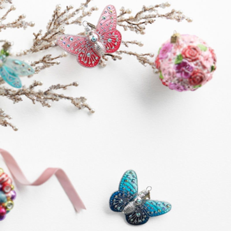 NEW for 2025 Bring your garden dreams into your home this Christmas with a few sparkling butterfly ornaments! Choose pink or blue- each one with glass bodies and acrylic wings accented with silver glitter and shimmering jewels!Each sold individually.Made b
