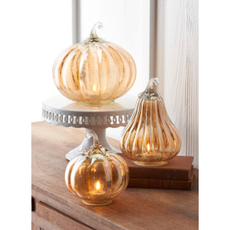 Grab yourself a perfect piece that works for Halloween and Fall! Each pumpkin features a light orange-copper color glass! Choose one of three sizes, perfect to place on your mantle or coffee table!Each sold individually.Made by Raz Imports. Candles shown n