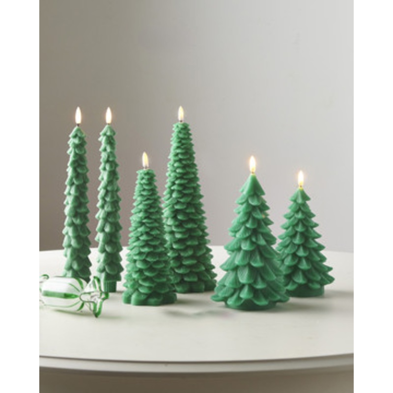 NEW for 2025 These gorgeous candles look like Christmas trees! Each one is made of wax with branch detailing! Choose the size that works best for you and decorate your mantle! Made of wax.Custom Timer Function.Battery Life Approx 120 Hours.Remote Ready.Can