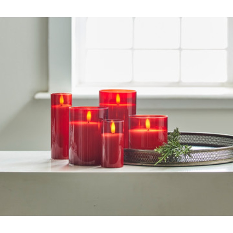 These gorgeous red cannisters have a wax candle inside with a realistic looking flame flickering away! Perfect to place up on your mantle or along your coffee table! Set the timer and enjoy candlelight all Christmas long! Made by Raz Imports.Made of glass