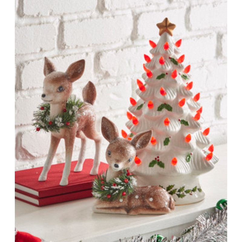 NEW for 2024 Bring in the feel of nostalgia from your favorite vintage Christmas decorations you remember from being a kid! These little cute deer are light brown with small white spots dusted in glitter with a fluffy berry wreath draped around their necks