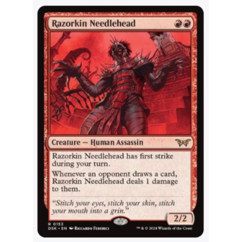 Razorkin Needlehead has first strike during your turn.Whenever an opponent draws a card, Razorkin Needlehead deals 1 damage to them.Rarity:R#:153Card Type:Creature Human AssassinCasting Cost: RR