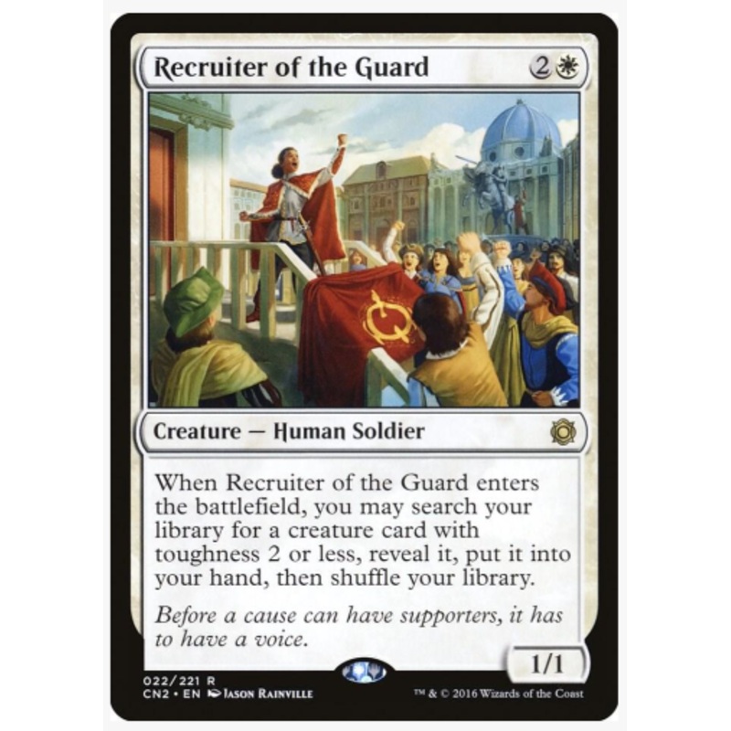 When Recruiter of the Guard enters the battlefield, you may search your library for a creature card with toughness 2 or less, reveal it, put it into your hand, then shuffle your library.Rarity:R#:22Card Type:Creature Human SoldierP / T:1 / 1Flavor:Before a
