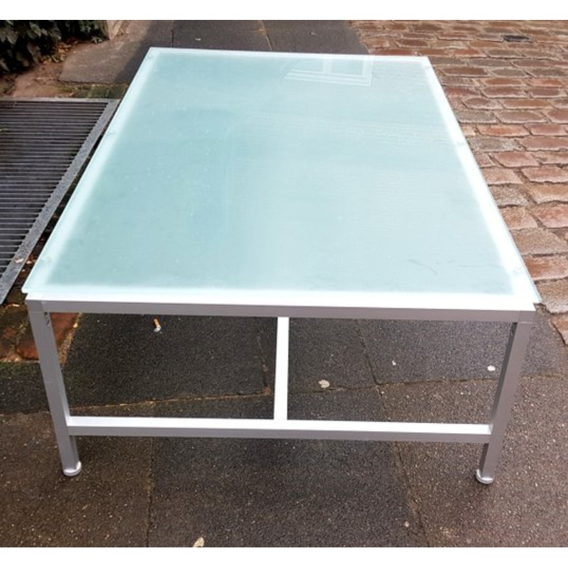 Sandblasted Glass top on an aluminum frame. Can be used as a coffee table or by the pool or in the winter garden Design Period 1980 to 1989 Production Period Unknown Style Minimalist, Modernist Detailed Condition Very Good This vintage/antique item has no