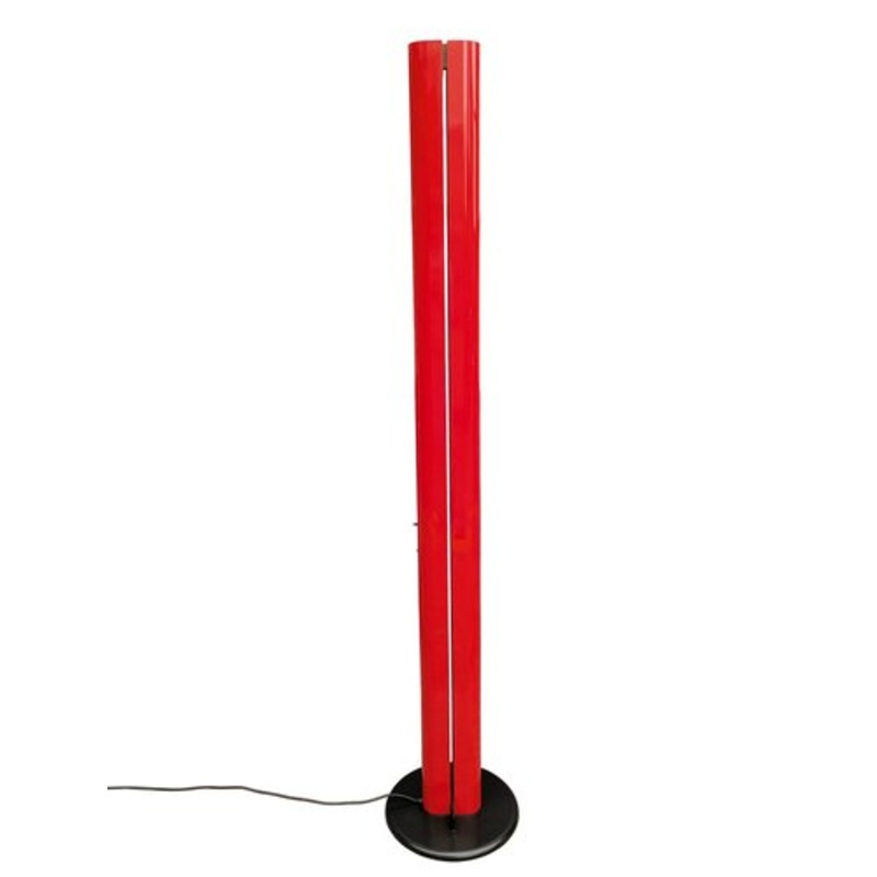 Black plastic round base, rare red painted metal body and aluminum floor lamp designed by Gianfranco Frattini in 1979 and produced by Artemide. Good vintage condition: signs of wear mostly locaded on the base. The dimmer control lever does not have a cover cap.