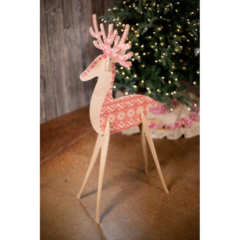 Bring a creative and festive flair to your holiday decor with this 18″x25″ deer decor piece. The combination of a soft beige tone and a red Christmas pattern enhances the unique geometric shaping of the deer. This versatile piece can be used to spruce up an entryway or near a fireplace or Christmas tree to bring a new dimension and fun holiday patterns.