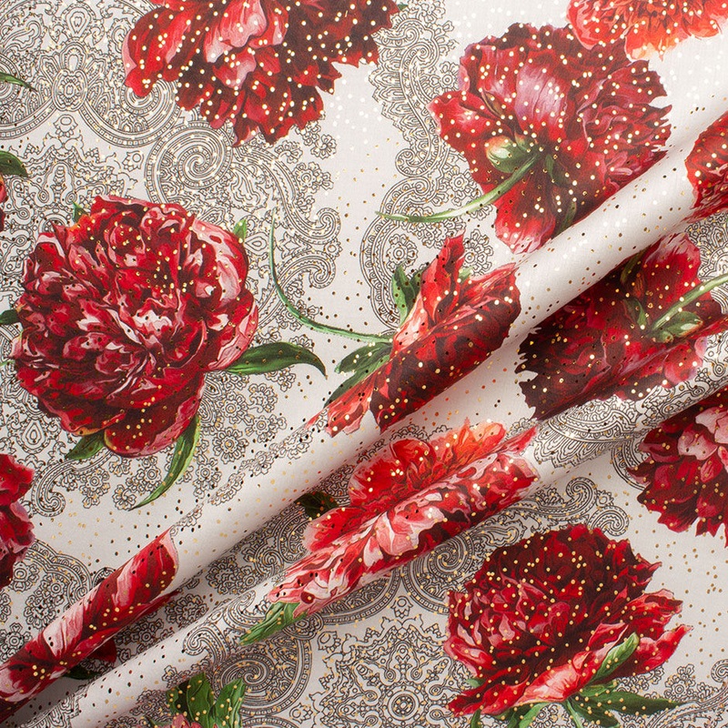 A stunning large deep red floralprinted palegreyluxurycotton with gold spotlaminate overlay by D’Est. Available in a variety of colours and prints, this laminated cotton is ideal for shirts, dresses and skirts.