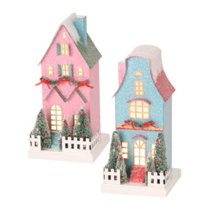 Choose a light pink house or a light blue house to adorn your mantle this holiday season! The pink house has a green A frame pitched roof with a blue chimney, while the blue house has a bell shaped red roof and a pink chimney! Each is dusted with bright white snow, light yellow trimmed windows, tiny green garland accents dotted with red bows, and decorated bottle brush trees adorning the yard behind a white picket fence! Battery operated. Timer function.Each sold individually.Made by Regency International.Made of cardboard.Dimensions: 10.5″.Item #: MTX73879