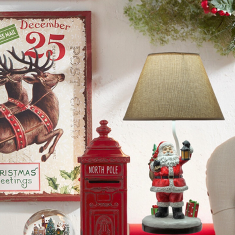 NEW for 2024 Making his way to load the sleigh on Christmas night, Santa wears a red suit with a lantern in one hand while the other holds a large toy bag that is slung over his shoulder behind him! This fun woodland Santa lamp is sure to look fabulous in