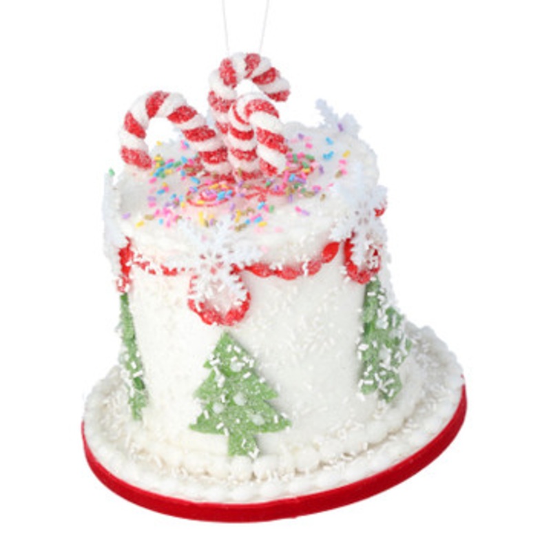 It’s time for cake…….decorations! This adorable Christmas ornament features a small white cake with green trees and red trim dotted with white snowflakes and rainbow sprinkles! The top of the cake has sweet as can be red and white striped candy canes! This would make a great mantle decoration, nestled in a large cloche in your kitchen, or hanging in your tree!Made by Regency International.Dimensions: 7.5″.Item #: MTX70545