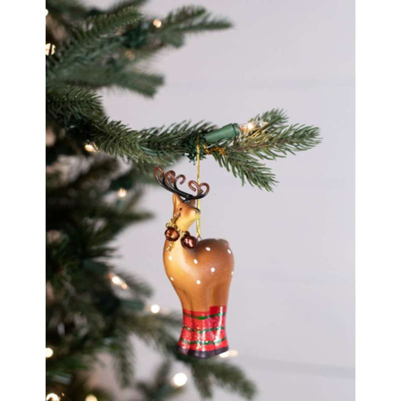 Add some playful yet classic detailing to your tree with this 5" reindeer ornament. These spotted brown reindeer have curly rich brown antlers and are adorned with jingle ruby red bells. The playful touch of red and green striped socks allow this ornament