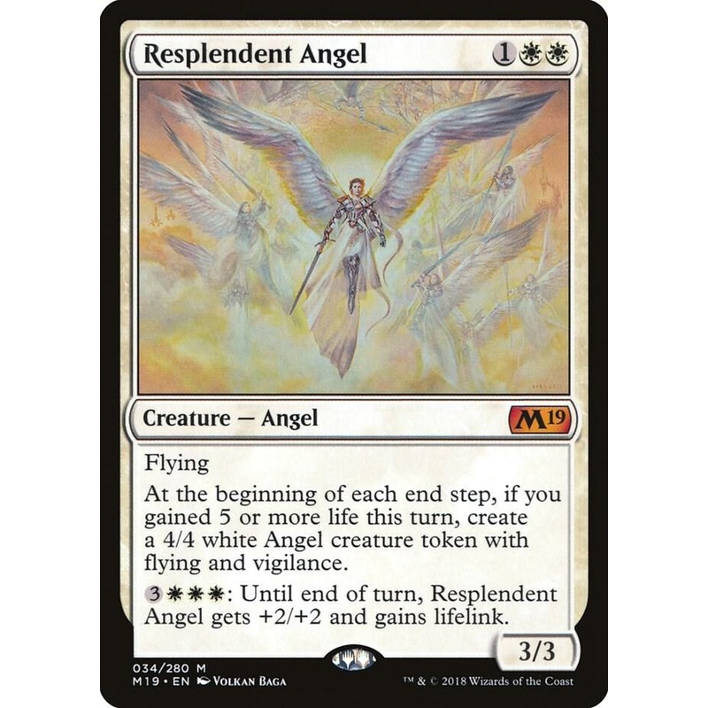 FlyingAt the beginning of each end step, if you gained 5 or more life this turn, create a 4/4 white Angel creature token with flying and vigilance.3WWW: Until end of turn, Resplendent Angel gets +2/+2 and gains lifelink.Rarity:M#:34Card Type:Creature Angel