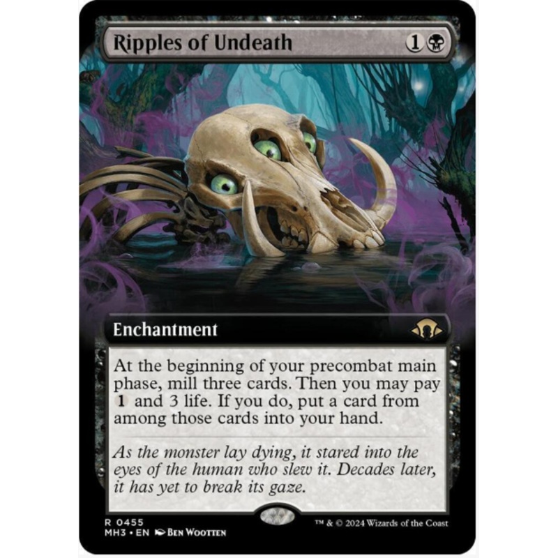 At the beginning of your precombat main phase, mill three cards. Then you may pay 1 and 3 life. If you do, put a card from among those cards into your hand.Rarity:R#:455Card Type:EnchantmentFlavor:As the monster lay dying, it stared into the eyes of the hu