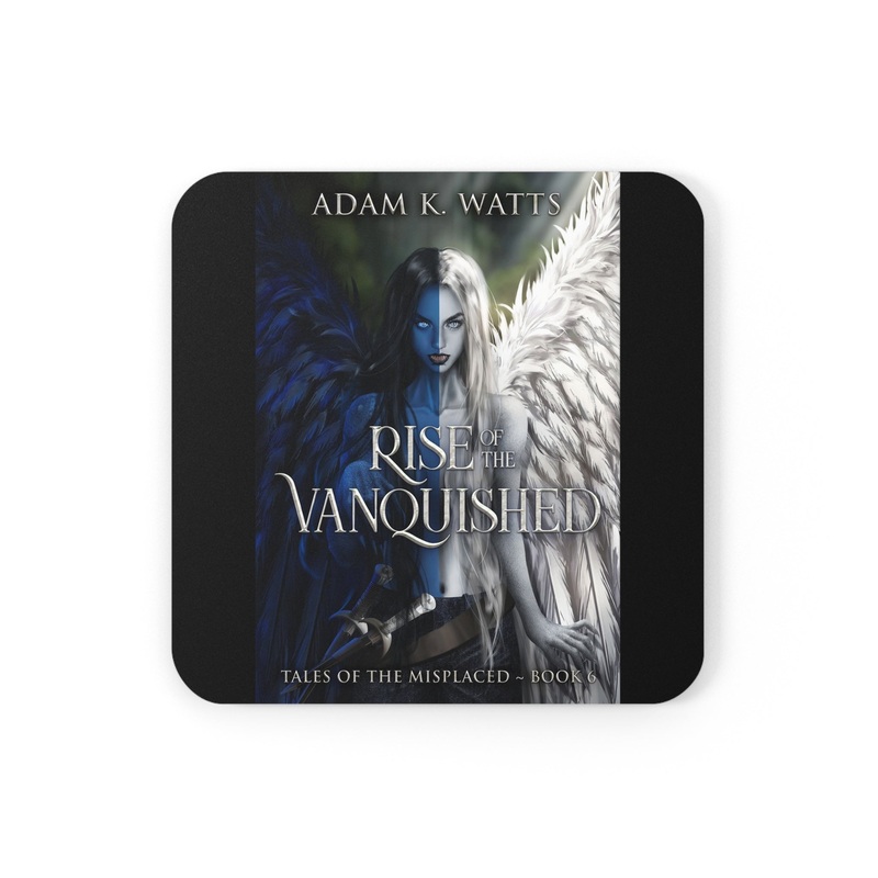 These coasters are made with a high-gloss top and feature a cork back to prevent sliding, and each order comes with a set of four coasters. The cover art in these coasters is from Adam K. Watts's book, Rise of the Vanquished.