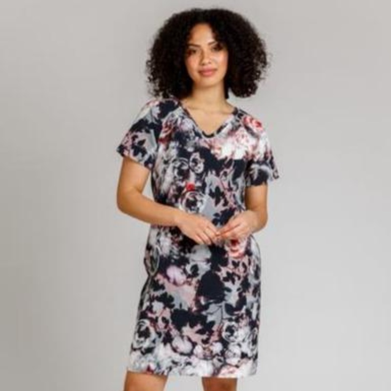 Reversible raglan dress or top that can be made in woven or knit fabrics. Pattern features loose fit, optional pockets and waist tie, as well as top and dress options. It can be worn with the V neck or the round neck side at the front.
