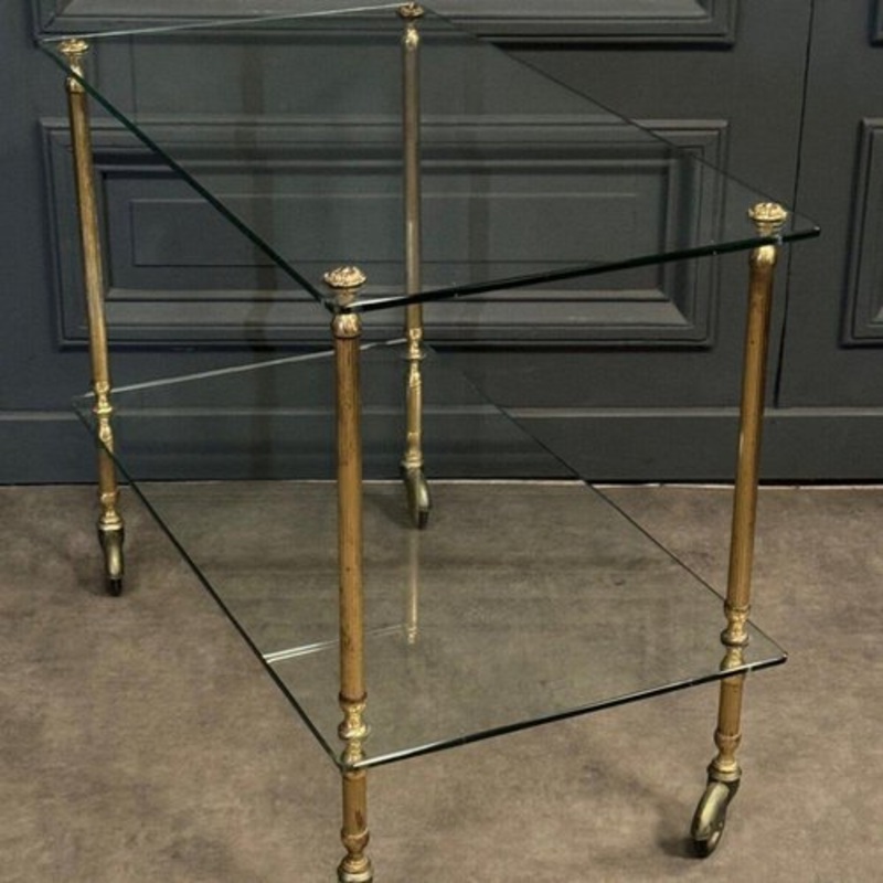 “1960 Rolling Bar with Two Glass And Gilded Brass Trays” Here is a rolling bar from the 60s, in fluted gold metal and two glass trays. It is in good general condition, note classic scratches from use, minor accidents on the glass at the bottom. We will not deliver by post for this type of item too fragile, but we work with carriers, please contact us for a quote. Sold as is. For the condition, please detail the photos. The photos are an integral part of the . Dimensions: Height: 65 cm Length: 84 cm Width: 45 cm Height of the bottom tray: 22 cm Height of the top tray: 64 cm L8910