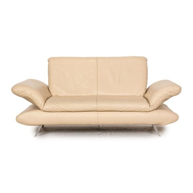The Rossini sofa from Koinor is covered in cream-colored genuine leather and stands on slanted metal feet. The two-seater impresses with its minimalist, timeless design and adjustable armrests.