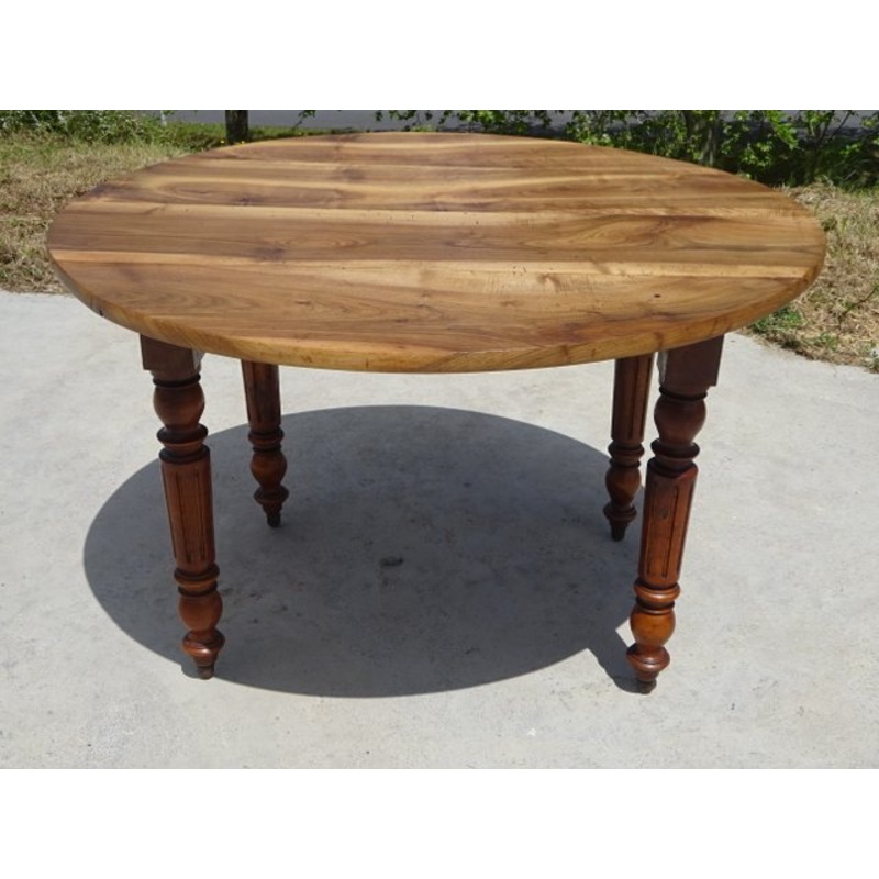Round top, 116 cm in diameter, in solid walnut, colorless finish.Walnut baluster legs in the Louis Philippe style.Beautiful Louis Philippe period table, all in solid walnut. Sanded top, raw bistro varnished wood, very resistant.Folded top 116x64 cm. Height