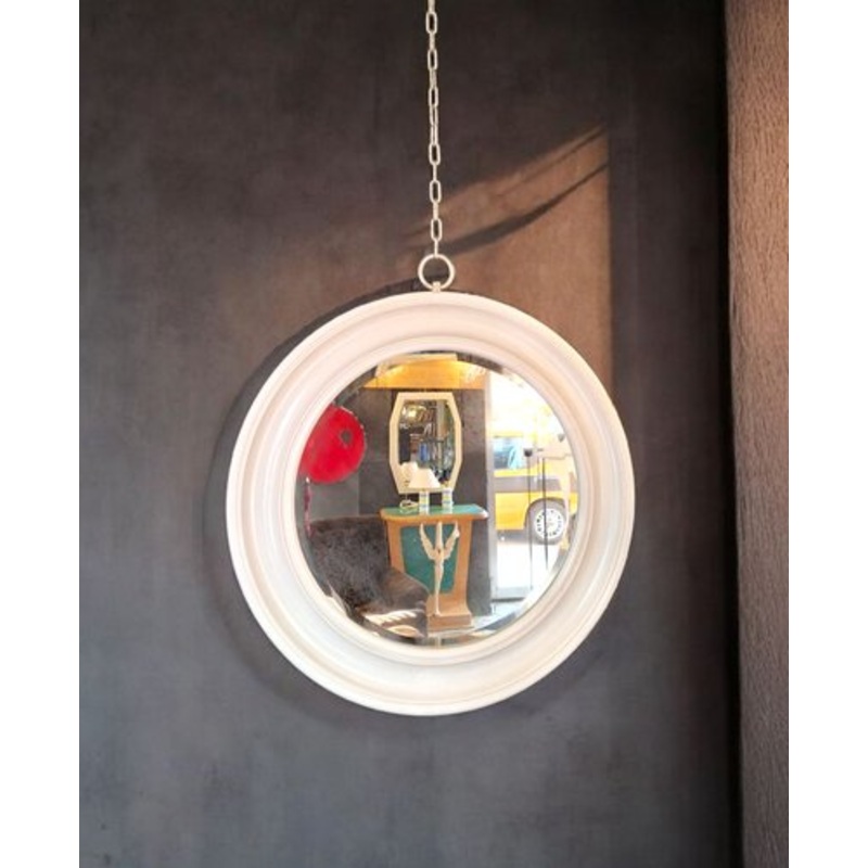 Round mirror made of white lacquered wood and support with steel chain. The mirrored part is bevelled. The diameter of the mirrored part is 50 cm. The chain measures 70 cm.