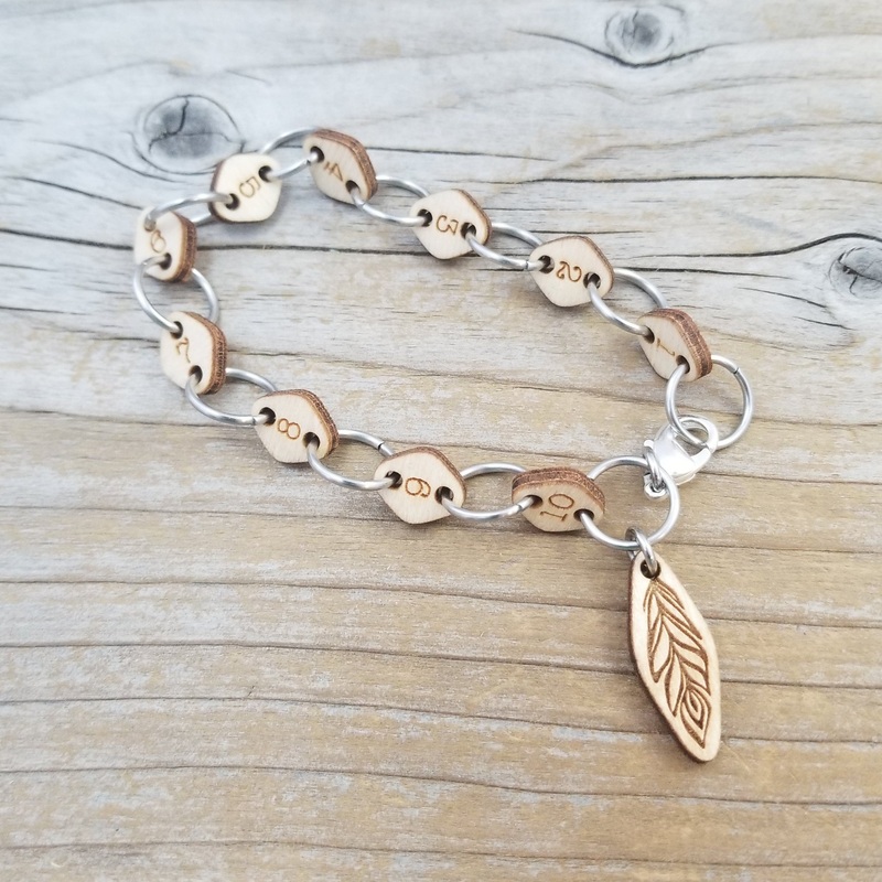 Our Row Counting Bracelet makes keeping track so much easier! Each link in the bracelet has a number etched into the wood – slip the ring onto your needles like a stitch marker and the number hanging below will tell you which row you are on.