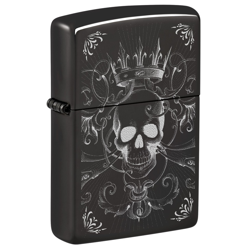 Surrounded by intricate filigree, a regal skull grins from the surface of this classic High Polish Black lighter in a mysterious Photo Image design. Comes packaged in a gift box. For optimal performance fill with Zippo lighter fuel.