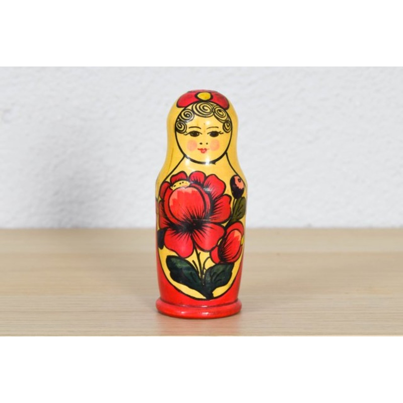 Beautiful hand painted Russian wooden piece.Matryoshka doll in beautiful and bright colors.Only piece availableMeasuresDiameter 3.5 cm.Height 9.5 cm. Design Period 1960 to 1969 Production Period 1960 to 1969 Country of Manufacture Russia Style Folk Art, Vi