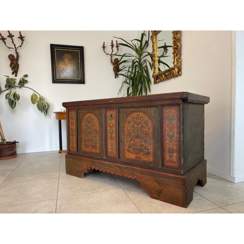 Original rural Biedermeier farm chest chest Salzburg dimensions. Height 89 x 154 x 67 For sale is an old farmer’s chest / farmer’s base chest / sideboard from around 1830. This chest is a true gem of traditional craftsmanship and rural aesthetics. Made from high-quality natural softwood, it combines functionality with artistic design. The very nicely designed base at the front gives it an elegant yet rustic touch. The hand-painted floral motifs and decorations are a special highlight: on the front there are detailed painted flower baskets and cassette fillings that radiate a harmonious and warm atmosphere. The side surfaces and the lid are also carefully and individually hand-painted, which underlines the craftsmanship and unique character of this chest. The construction is particularly interesting: the chest is not only decorative, but also functional and ready for use. Its excellent condition and originality make it an exceptional piece that impresses both as a piece of furniture and as a collector’s item. This is a real dream specimen that will bring the charm of bygone times into your home!