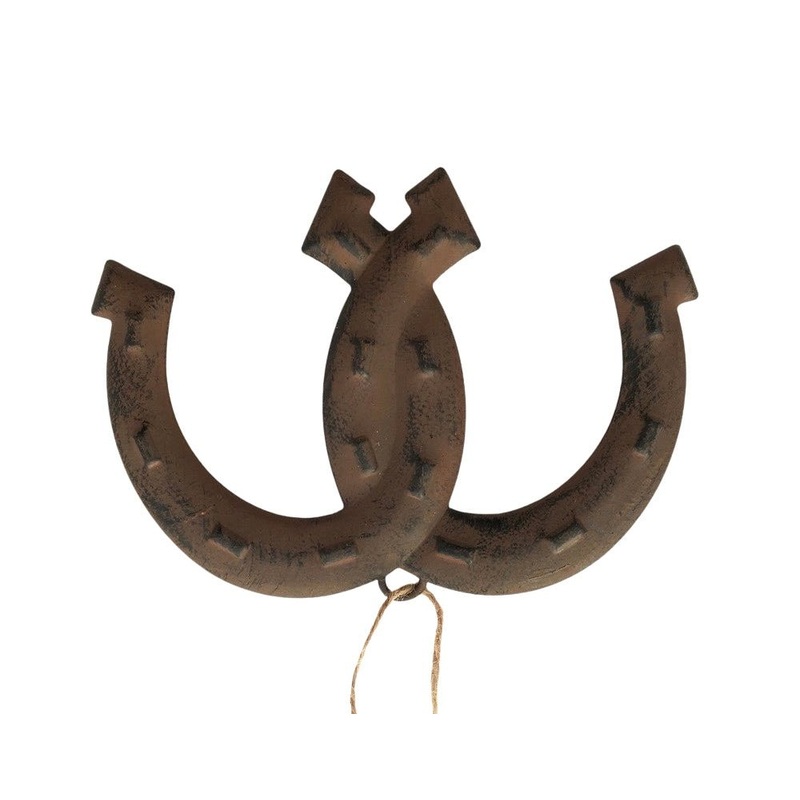Brown Rustic Tin Horseshoe ornament with jute string hanger. One-sided. Cute for western themed Christmas decor accents! Measure 6" x 4"
