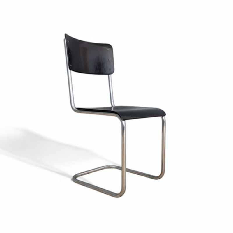 Early version manufactured by Vichr & co. , former Czechoslovakia in the 1930s. Made of black lacquered plywood and sturdy chrome plated tubular steel frame, showcasing vintage charm. The steel elements exhibit some minor signs of aging, while the wooden parts remain well-preserved. Dating back to the 1930s, indicated by the design details such as the two rounded ends of the steel tube in the backrest area, lacking pipe caps.
