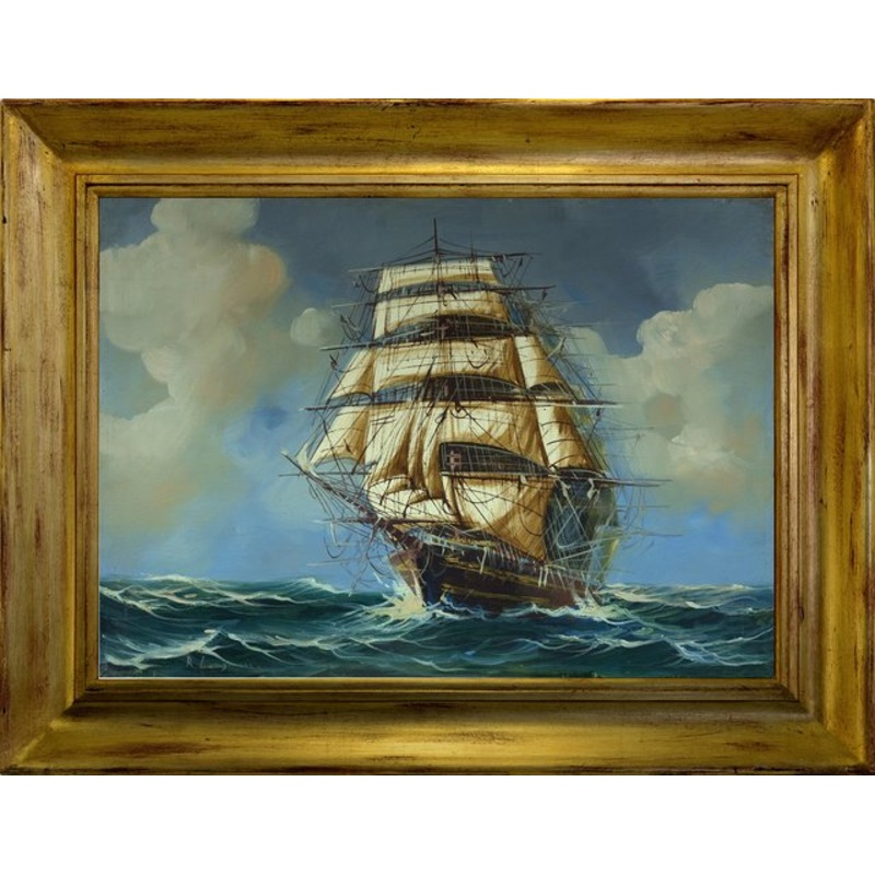 Oil on canvas depicting a sailing ship in the sea by the Naepolitan painter Renato Longanesi.Painting size cm.70x50 Period 1990 to 1999 Production Period 1990 to 1999 Country of Manufacture Italy Identifying Marks This piece has an attribution mark Style F