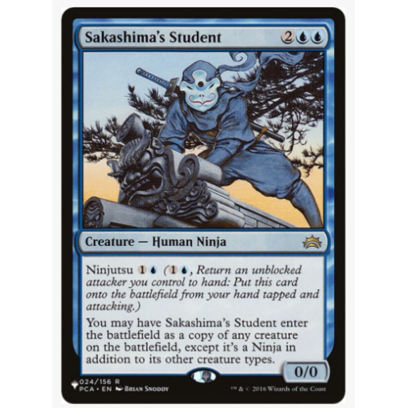 Ninjutsu 1U(1U, Return an unblocked attacker you control to hand: Put this card onto the battlefield from your hand tapped and attacking.)You may have Sakashima's Student enter the battlefield as a copy of any creature on the battlefield, except it's a Nin