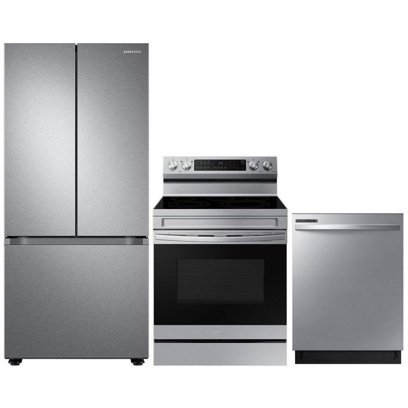 Samsung 3-piece kitchen package. This french 3-door refrigerator features Digital Inverter Compressor, All-Around Cooling, built-in Wi-Fi and a total capacity of 22 cu. ft. The freestanding electric range features WI-FI connectivity, Convection Technology, 5 cooktop elements and a total oven capacity of 6.3 cu. ft. Completing this 3-piece kitchen package is a 24-inch top control dishwasher with 4 wash programs, child lock and can accommodate up to 14 place settings.