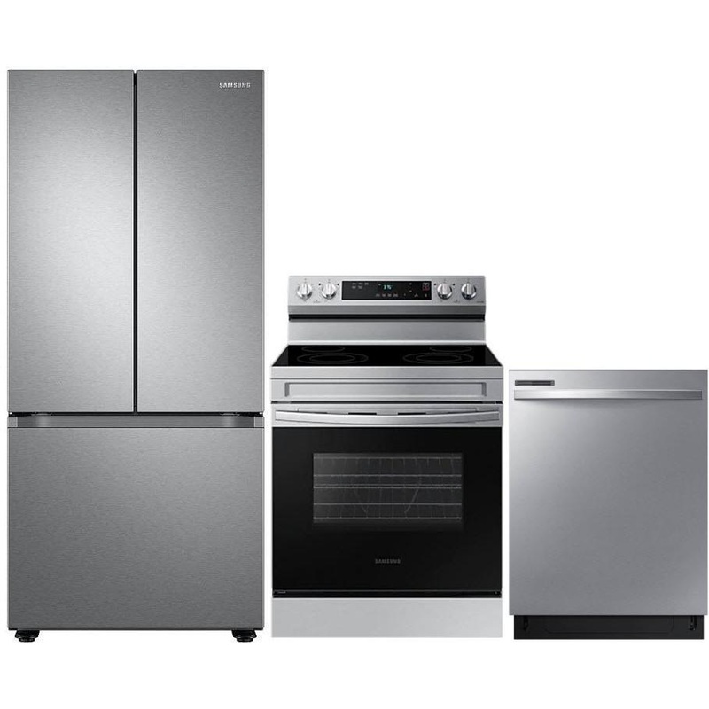 Samsung 3-piece kitchen package. This french 3-door refrigerator features a Digital Inverter Compressor, All-Around Cooling, built-in Wi-Fi, and a total capacity of 22 cu. ft. The freestanding electric range features WI-FI connectivity, SmartThings cooking, a total oven capacity of 6.3 cu. ft. and 4 cooktop elements. Completing this 3-piece kitchen package is a top control dishwasher with StormWash, AutoRelease and can accommodate up to 15 place settings.