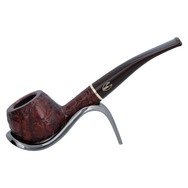 Savinelli Alligator smoking pipes are pleasing on the eye and fabulous in the hand. These exotic handmade briar pipes look like Alligator hide, modern, rugged and all individual. A warming chestnut bowl sits before a solid brass coloured metal band and glossy Cumberland stem, making a friendly combination. An excellent everyday smoker with a 6mm balsawood filter.