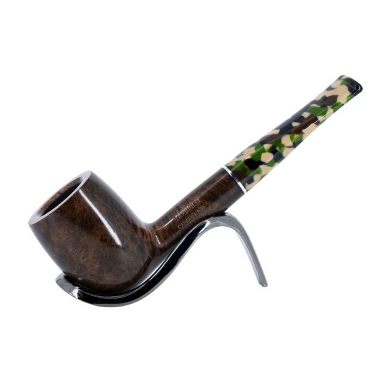 Savinelli Camouflage Smooth Brown 111 - 6mm Briar Pipe The new Savinelli Camouflage series boasts a camouflage designed stem perfect for any outdoor pursuit. The series has shapes available in both Smooth Brown or Rusticated Black. An aluminium ring splits