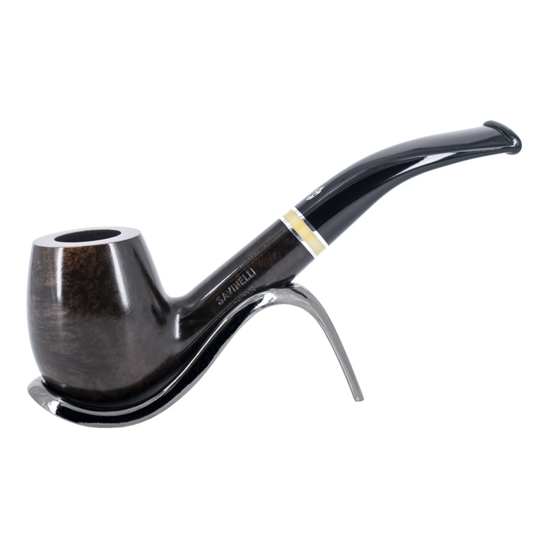 The Oscar series has featured in Savinelli’s lineup for many a long year. This particular pipe has a smooth brown finish and for a bit of eye candy features a beige-coloured composite band with a thin chrome band at each end. The black acrylic stem sets the scene.