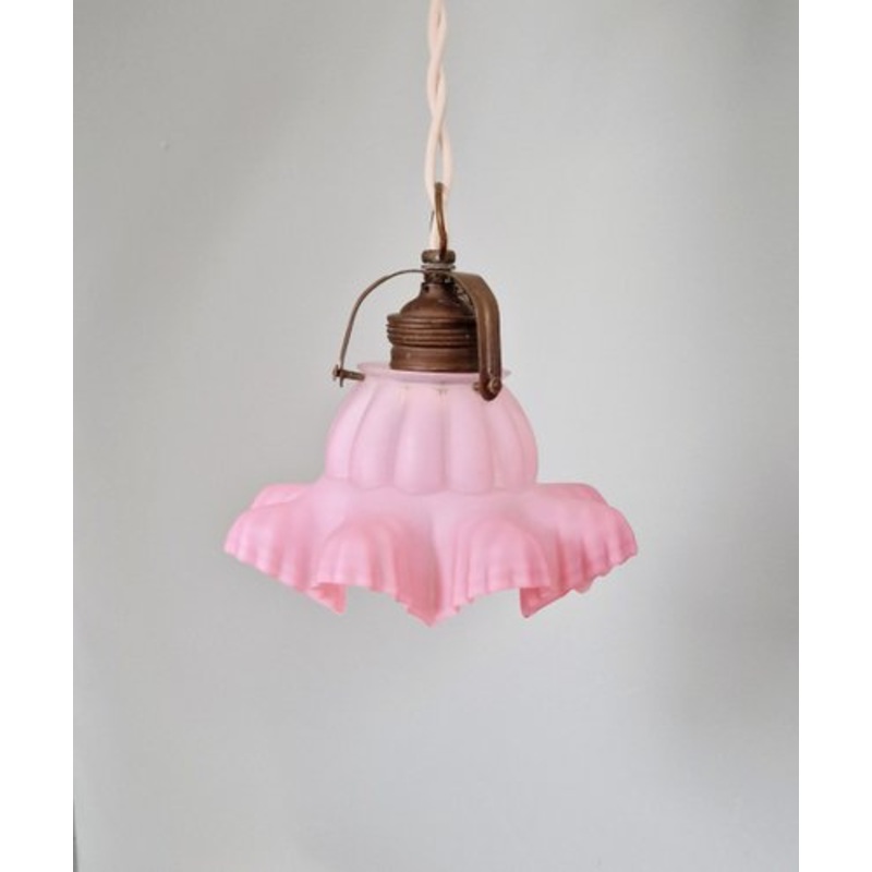 Pendant lamp/walking lamp in scalloped pink satin glass, 1920s-30s.The suspension has been re-electrified and is compatible with an E27 LED bulb.Dimensions (without cable): 15 x 15 x 15 cmTotal height: 130 cm Design Period 1920 to 1949 Production Period 19