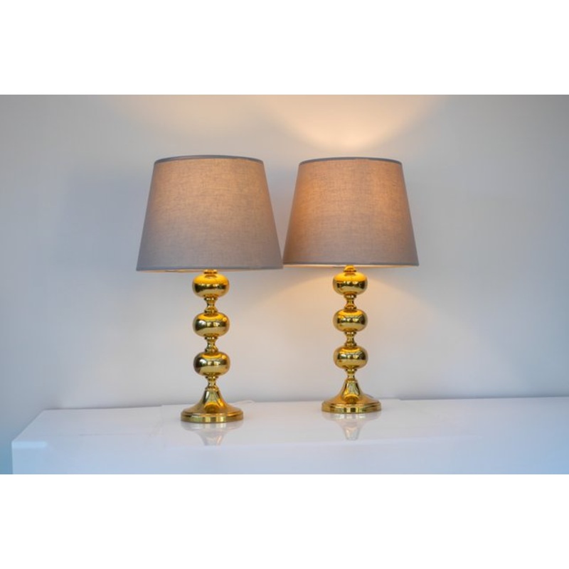 A fantastic pair of rather large matching vintage brass space age table lamps, from NAFA, Nybro, Sweden. These lamps are simple in the design, with 3 round spheres. The shapes are simple, yet it is the golden brass colors that makes these lamps very special. These lamps have a classic elegant and sophisticated design and will make a statement in any interior setting.