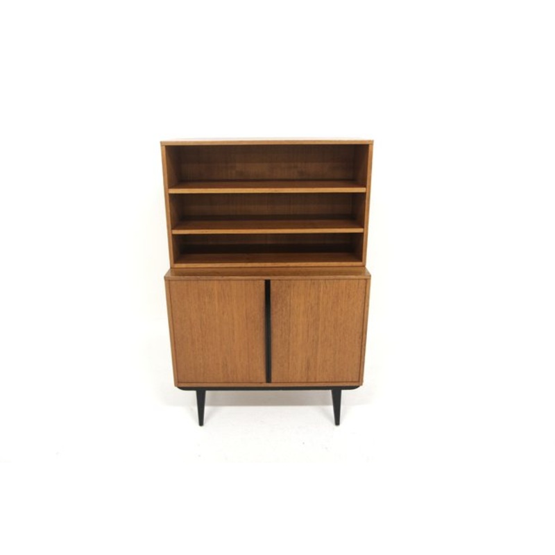1950 teak chest of drawers produced by the Swedish manufacturer Brntorps.It consists of a low chest of drawers with cupboard storage and an upper shelving structure.Beech base painted black.Furniture in 2 parts.Excellent condition with minimal signs of wea