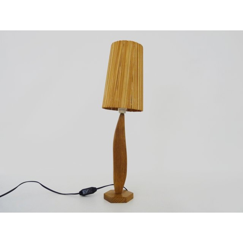Very beautiful sculptural lamp, the base is carved from oak wood, the lampshade follows the curve of the base which gives it a slightly leaning look.