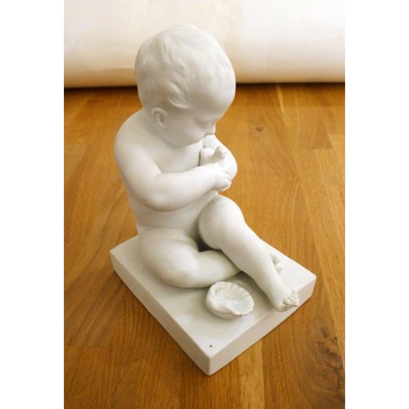 Sculpture representing a young child with a bird (dove): small rectangular base, on which sits a little naked boy, holding in his hands & feeding a bird; shell placed next to it, containing food