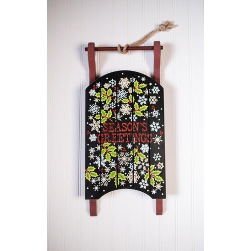 Create a cozy farmhouse feel in any room with our 21.5"x9.5" "seasons greetings" sleigh wall decor piece. The beautiful and bright pattern from the snowflake and holly print stand out perfectly on the black background and the warm red base. This piece will