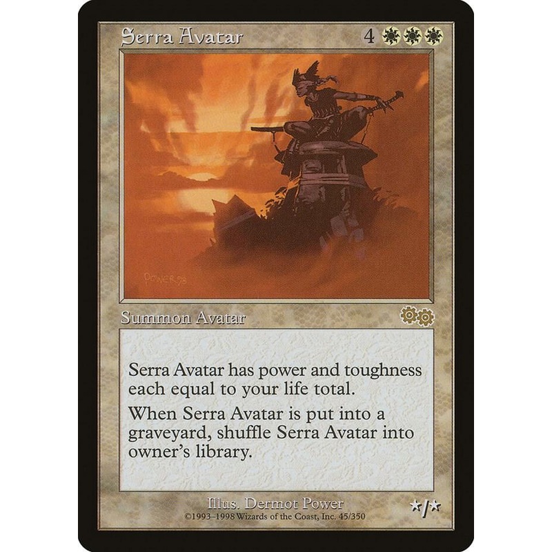 Serra Avatar has power and toughness each equal to your life total.When Serra Avatar is put into a graveyard, shuffle Serra Avatar into owners library.Rarity:R#:45Card Type:Summon AvatarP / T:* / *Casting Cost:4WWW