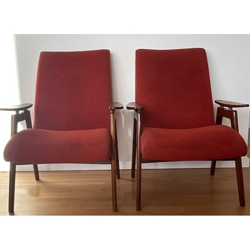 Discover the timeless elegance of a pair of Jaroslav Smidek for Jitona armchairs, a testament to classic design and craftsmanship. These antique armchairs, dating back to the mid-20th century, showcase a striking red hue that adds a bold splash of colour t