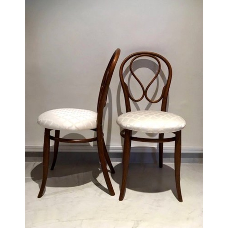 Bentwood chairs with later silk-blend seat upholstery. Chairs designed by August Thonet, the son of original bentwood furniture designer Michael Thonet. August took over his father’s business in 1869.