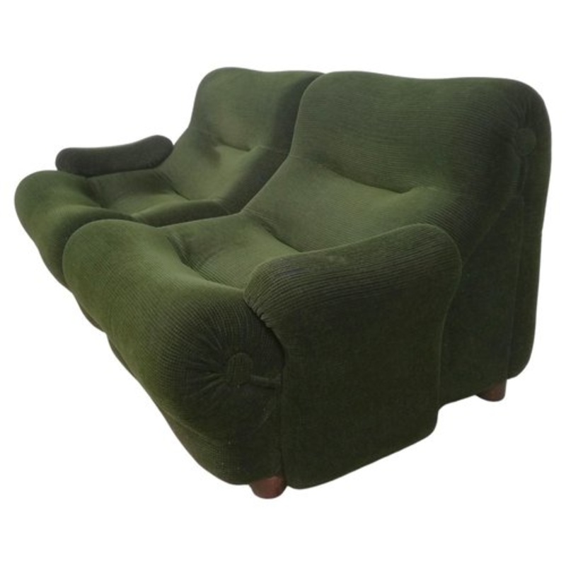 The combination offered consists of 2 modules with side armrests to form a 2-seater sofa. It is possible to add multiple modules thanks to the steel levers placed in the lower part that allow you to connect more modules and create a sofa of the dimensions you want. On our dedicated page of First Dibs we have another 1 module without armrests that can be inserted as a central junction. The sofa is in good structural condition but needs new upholstery. Reach out for any additional questions.