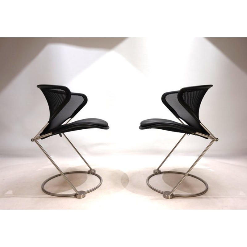 The two Nuvola chairs come in excellent, like new condition. The solid stainless steel frame harmonizes perfectly with the tightly stretched black polyester mesh of the seats and backrests. The net was bordered at the corners with black leather straps. Thi
