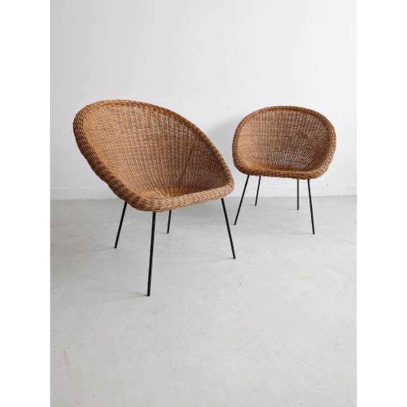 Set of 2 French bucket chairs, with rattan seating and elegant black lacquered steel legs. Set of 2. Design Period 1970 to 1979 Production Period Unknown Style Bohemian Detailed Condition Very Good This vintage/antique item has no defects, but it may show