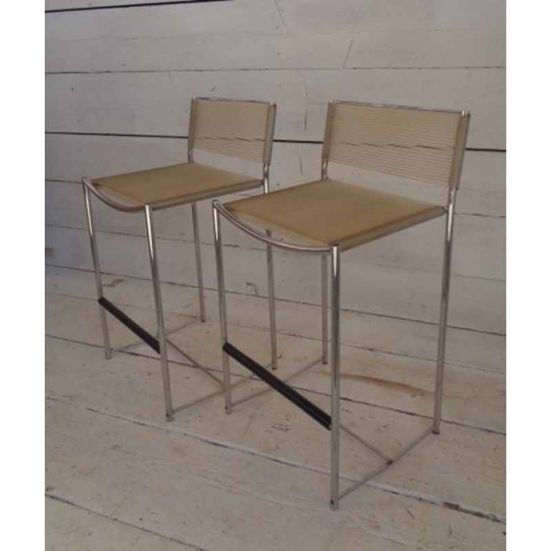 Pair of Spaghetti bar stools by Giandomenico Belotti for Alias, designed in the 1970s. Called “Spaghetti” for the use of transparent rubber material which is stretched to the structure to form the seat and backrest. The vintage condition is excellent.