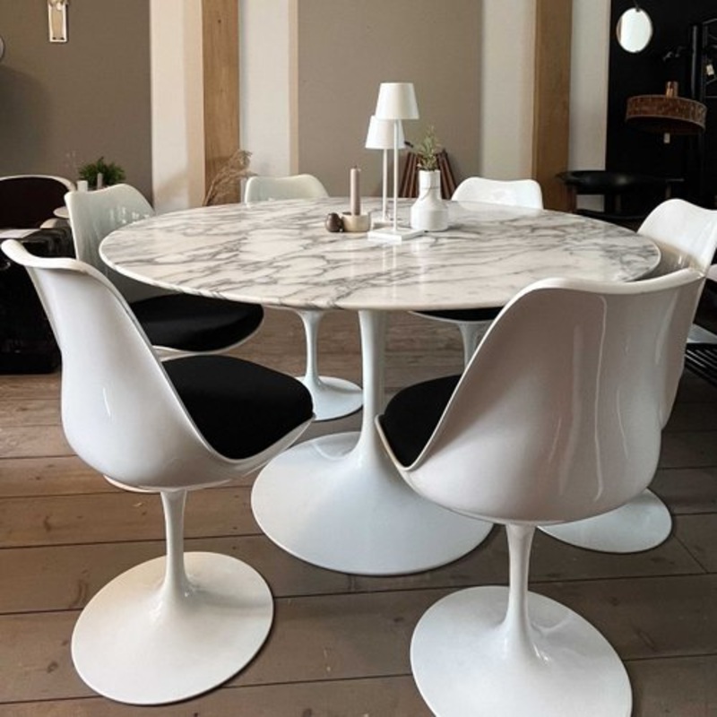 Tulip chairs by Eero Saarinen for Knoll. White paint with various signs of wear, see photos. Black cushion in nice condition. The chairs cannot be rotated. Wonderful seating comfort.